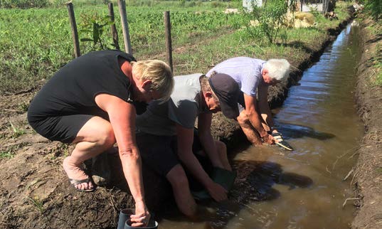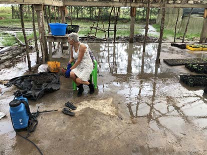 Ontbijt en we gaan op weg voor een bezoek aan Mary. We willen graag haar kinderen en man ontmoeten. We weten dat Mary het erg waardeert als we hier de tijd voor nemen. Tijdens de reis naar Mary plenst het. Na een gezellig koffie uurtje met de kinderen en haar man (die hebben we niet eerder ontmoet) gaan we toch op weg naar de tuin om te zien hoe het ervoor staat. Joey (James moest naar het vliegveld) durft het niet aan om over de brug te gaan want het is een modderpoel. We vinden het een verstandig besluit en stappen uit om verder te lopen. Dat op zich is al een kunst. Op de tuin valt het met bakken uit de lucht. Je ziet de teleurstelling op het gezicht van Tom want het water is ondanks de ditches (slootjes) niet af te voeren. Erg frustrerend voor ons allemaal. Mr Mark komt nog langs om wat zaken rond de nursery door te nemen. Het water stroomt zelfs de nursery in. Rond 13.00 uur besluiten we terug te gaan, wadend door het water, geen weg meer te zien zoveel water als er dan kan vallen. Hoe moet dat nu verder als de groep komt?????